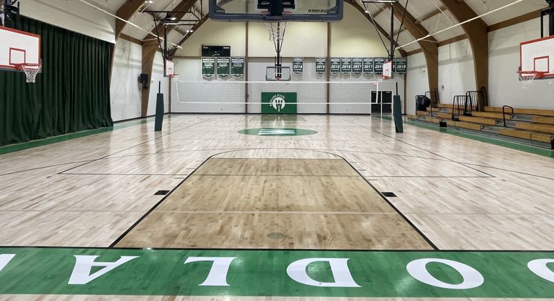 The newly designed maple wood court includes the traditional Woodlawn green and white colors. Center court showcases the Woodlawn “W” and the sides of the court display the school name. The basketball court is one of many improvements that are being funded by the 2022 fundraising Gala and generous donors.